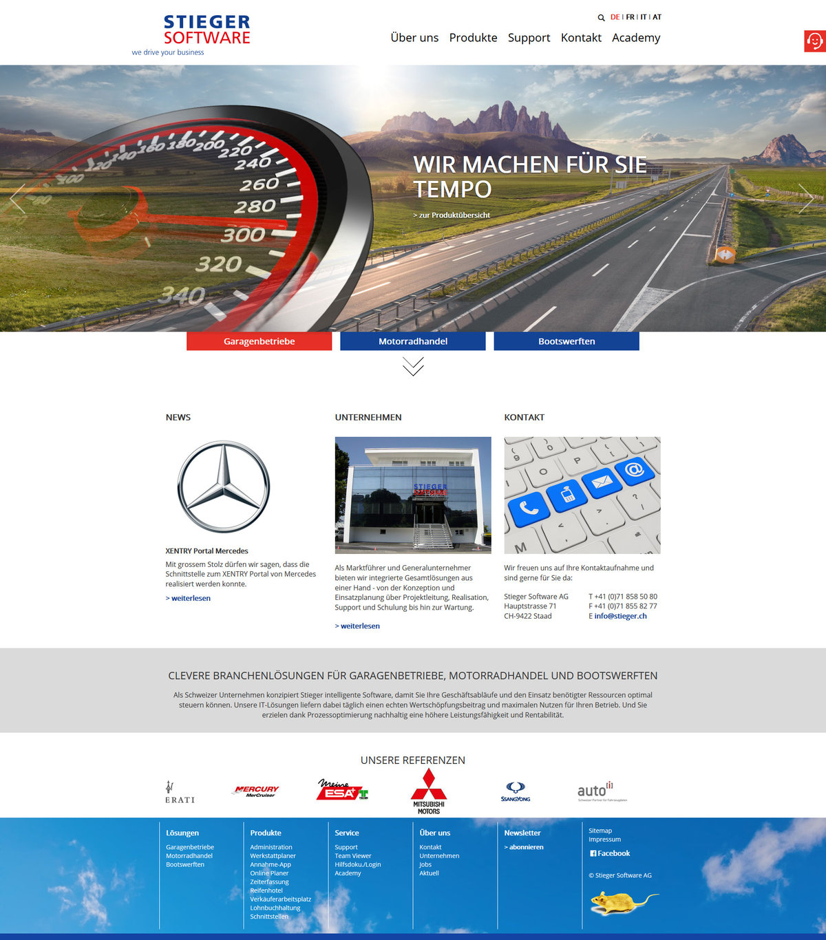 Die Stieger Software AG aus Staad ist die Nummer 1 auf dem Schweizer Software Markt für Garagensoftware, für Software für den Motorradhandel und für Bootwerften. Stieger bietet Gesamtlösungen exakt auf die Branche abgestimmt. In Zusammenarbeit mit der Kommunikationsagentur des Kunden realisiert visions.ch die neue Website die viel Information und Kundennutzen bietet. Neben Produktinformationen realiserte visions.ch eine interaktive mehrsprachige Kursverwaltung mit E-Mail Funktionen und Kursmanagemet z.B. Zuodernung des Kursleiters im Backend. Buchbar sind Einzel- und Kombikurse. Die Page ist mehrsprachig und bietet differenzierte deutschsprachige Inhalte für CH und AT. Weitere Features sind Newsbereich mit Archivfunktion, Newsletter, visualisierte Standorte und geschützte Bereiche.