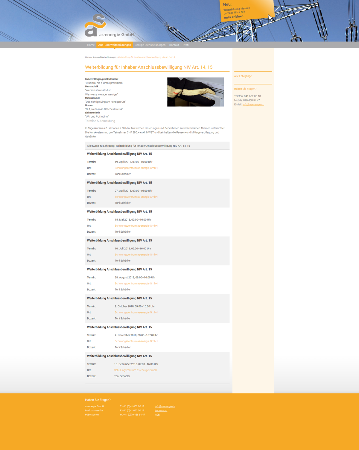 Die Seite der AS Energie erhielt in technischer Hinsicht ein komplettes Upgrade vom Vorgänger MODX Evolution zu MODX Revolution. Dazu wurde das komplette Kurssystem überarbeitet und auf die Bedürfnisse der Kurse angepasst. Die Teilnehmer können sich Online für einen Kurs anmelden, ebenso haben Sie die Möglichkeit auch nach dem Kurs die dazugehörigen Materialien zu downloaden sowie den Kurs zu bewerten. Der Kursleiter kann automatisiert Kurszertifikate automatisch generieren lassen und direkt via E-Mail versenden.