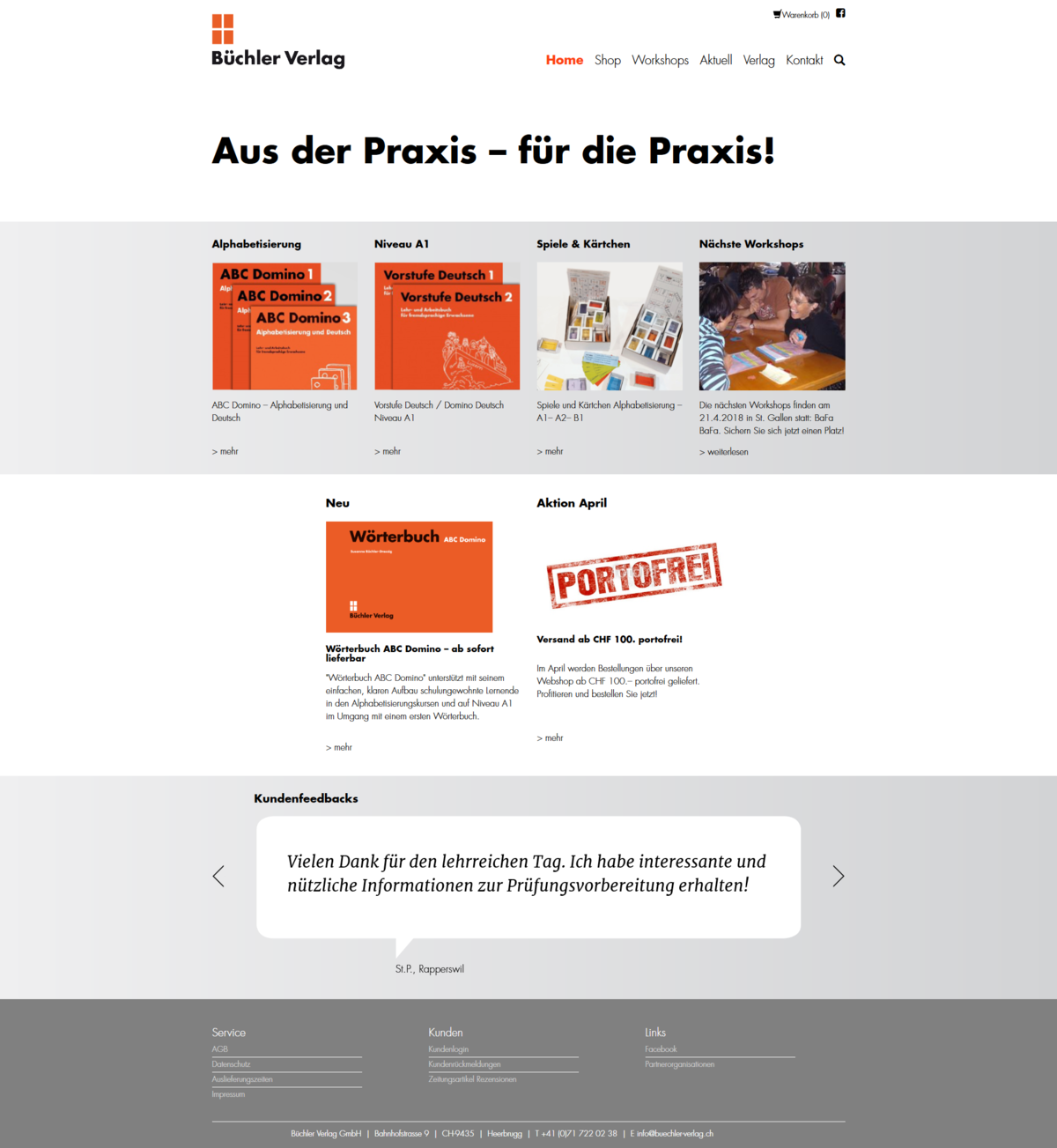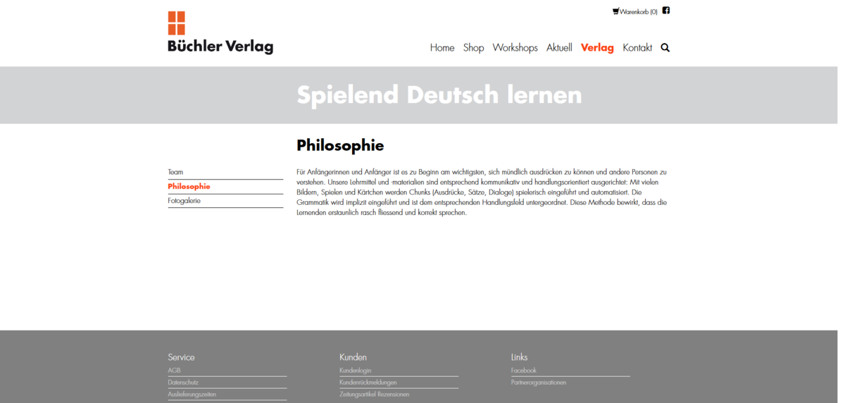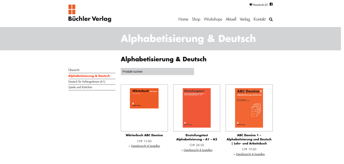 Der Büchler Verlag stellt seit mehr als 25 Jahren Lehrmittel für Deutschkurse zur Verfügung. Das Konzept des Verlages «Spielend Deutsch lernen» erfreut sich an grosser Beliebtheit. Die Lehrmittel sind darauf abgestimmt, dass die Teilnehmer möglichst schnell sich in der deutschen Sprache ausdrücken können und im Alltag selbständig zurechtkommen.