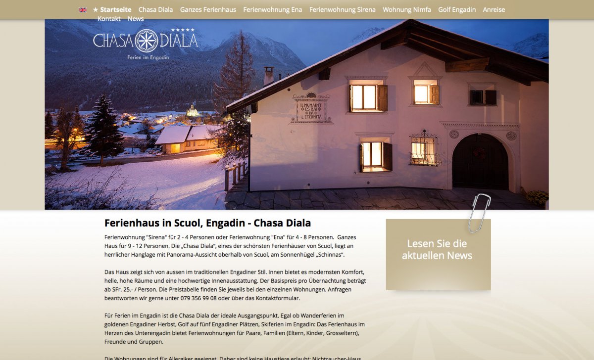 Eines der schönsten Häuser von Scuol am Sonnenhang freut sich auf Ihren Besuch. Die „Chasa Diala“ thront an herrlicher Hanglage mit Panorama-Aussicht im „Hollywood“ von Scuol, dem Sonnenhügel „Schinnas“