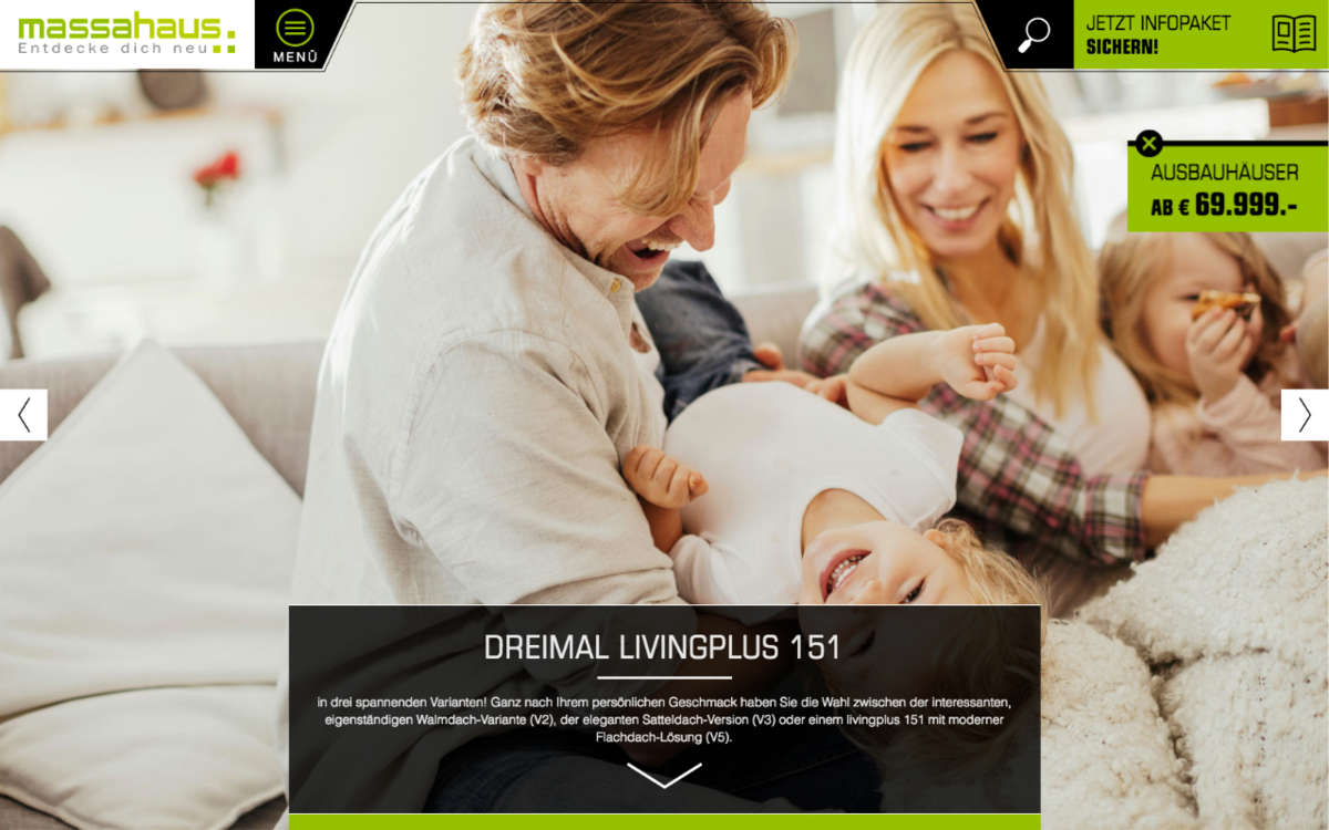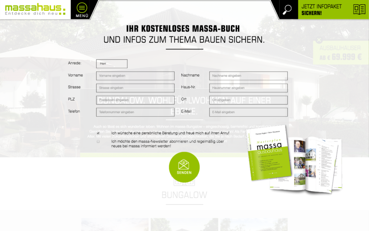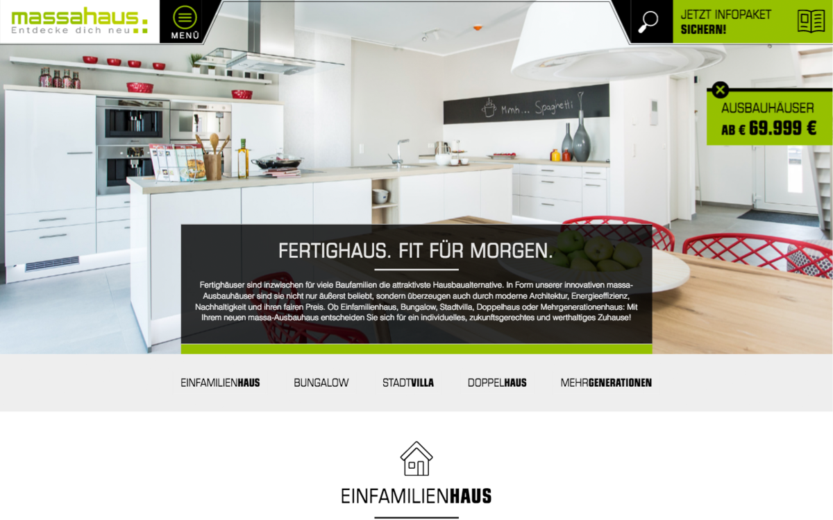 Im Auftrag der Werbeagentur Gabler aus Stuttgart durfte visions.ch den neuen Webauftritt des führenden Fertighausanbieters in Deutschland, massa haus, umsetzen. Die Webseite wurde im modernen Look mit vielen Parallax- und Scrolleffekten, teilweise als Onepager konzipiert und umgesetzt. Ziel der neuen Page ist es, die Conversionrate zu erhöhen und mehr massa haus Buchbestellungen bzw. Hausbestellungen zu generieren. Wichtige Komponenten sind testimonial integriert über die Musterfamilien, sowie Musterhäuser und Aufbauhäuser, die auf einer Google Karte nach Region ausgewählt werden können. Sorgfältige Realisierung mit MODx CMS-Framework Full Responsive und Bootstrapraster, modernsten Scripts sowie optimiert für mobile Endgeräte.