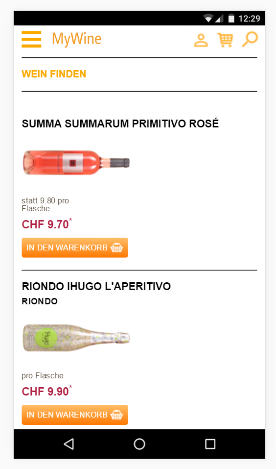 Während der Entwicklung musste der nahtlose Betrieb der Liveplattform sichergestellt werden. Zu diesem Zweck wurde ein Entwicklungsserver aufgesetzt und die Mobile Templates in HTML / CSS entwickelt. Der Inhalt wurde für die Mobileversion auf die wichtigsten Funktionen reduziert: Login Funktion oder für Neukunden eine Registrierfunktion, Produktefilter, Suchfunktion mit Weinfinder nach bestimmtem Kriterien und Merkliste.