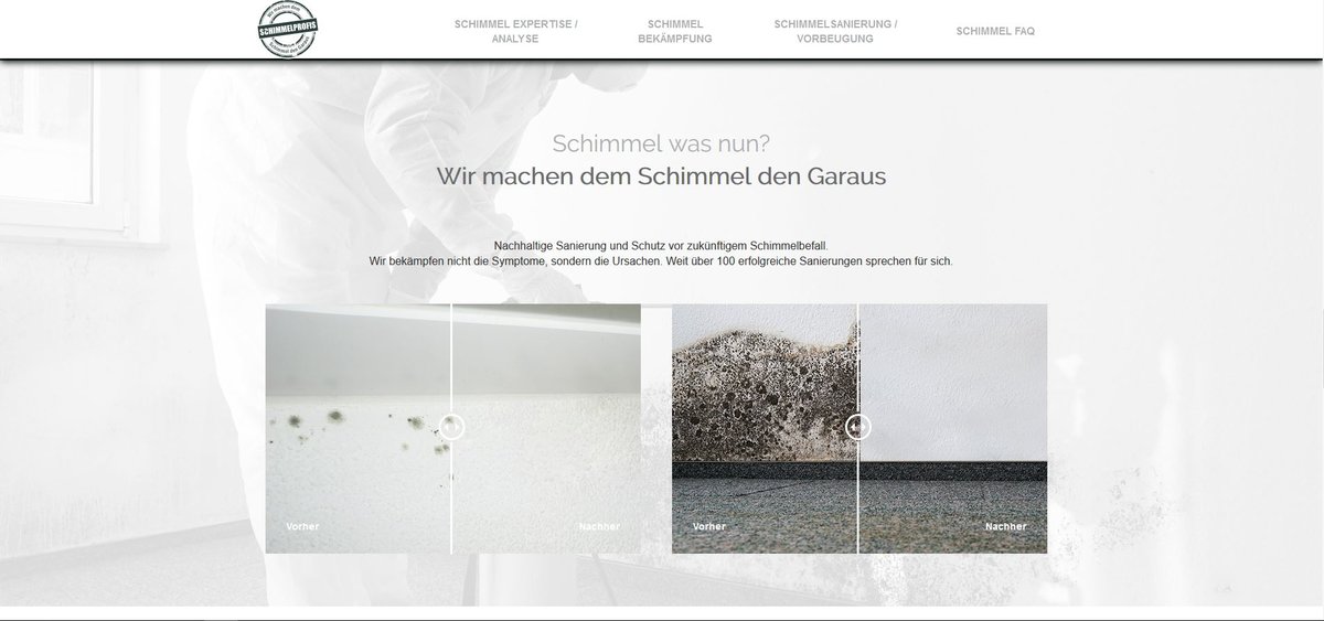 visions.ch erarbeitete das Konzept und realisierte die Webseite für Schimmelprofis inklusive responsives Design. Wie ebenfalls das Logo, das nun die Firmenfahrzeuge der Schimmelprofis ziert. Die Seite beinhaltet anschauliche Vorher-Nachher-Bilder sowie ein Kontaktformular für Kunden mit der Möglichkeit, Bilder hochzuladen.