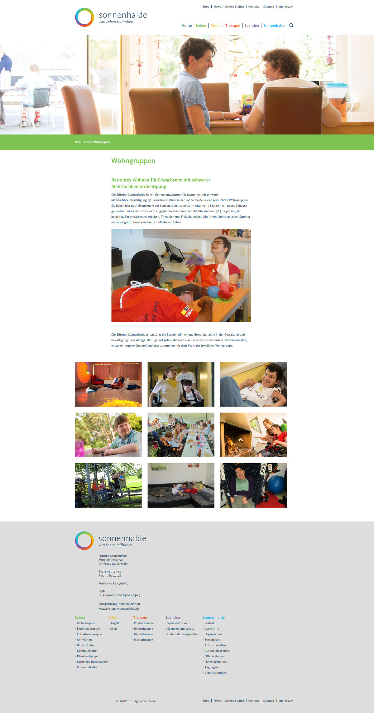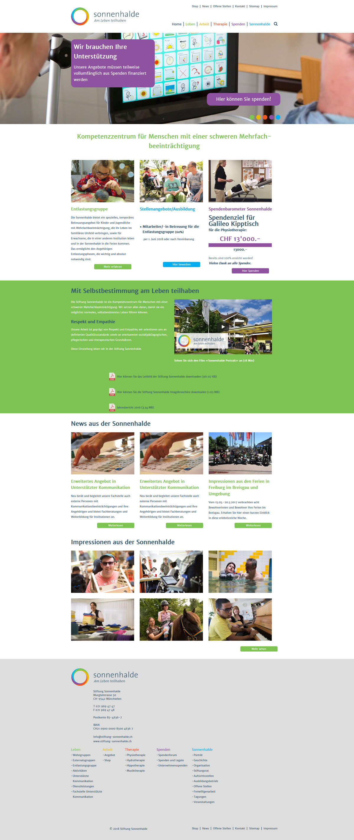 Die fröhlich und bunt gestaltete Webseite bietet Informationen rund um die Betreuungsangebote des Kompetenzzentrums in Weinfelden. Ebenso können im Onlineshop Produkte bezogen werden, welche von den Bewohnern gefertigt worden sind. Damit eine solche Institution längerfristig unterhalten werden kann, ist die Stiftung Sonnenhalde auf Spenden angewiesen. Auf der Webseite finden Sie diverse Möglichkeiten sich zu engagieren.