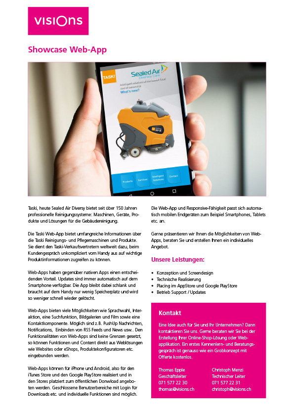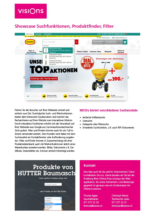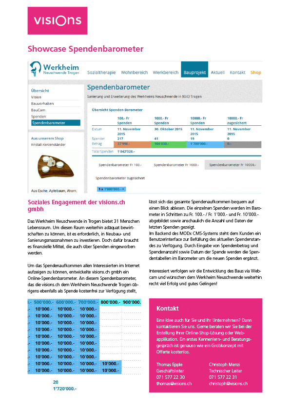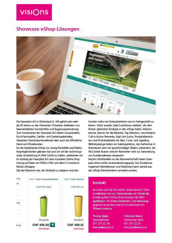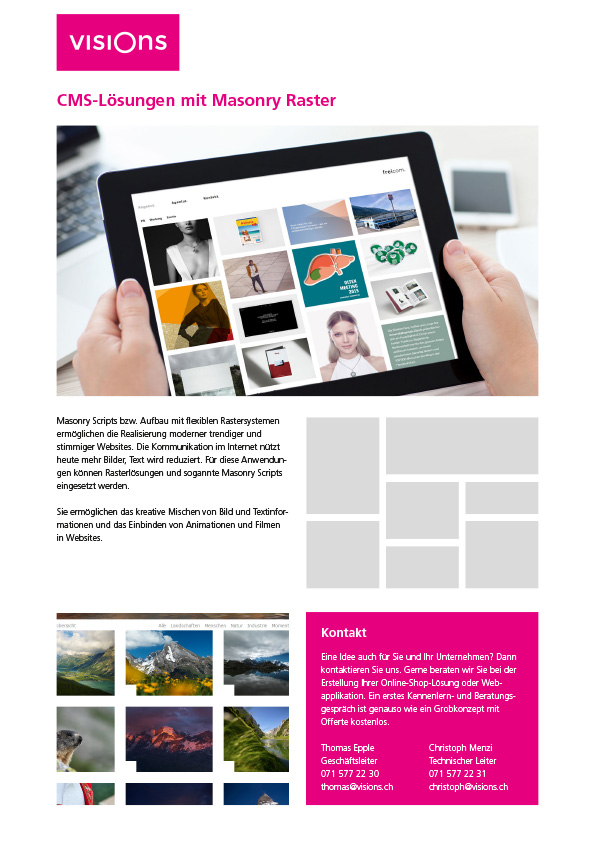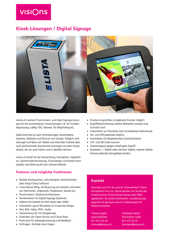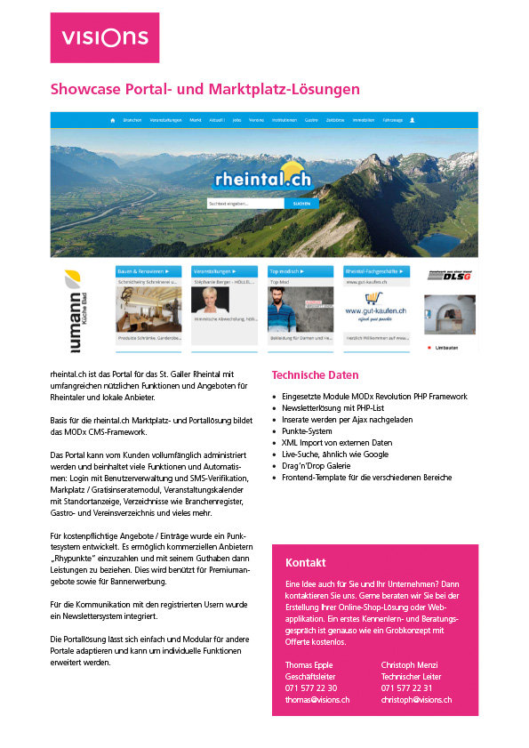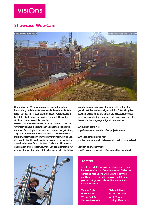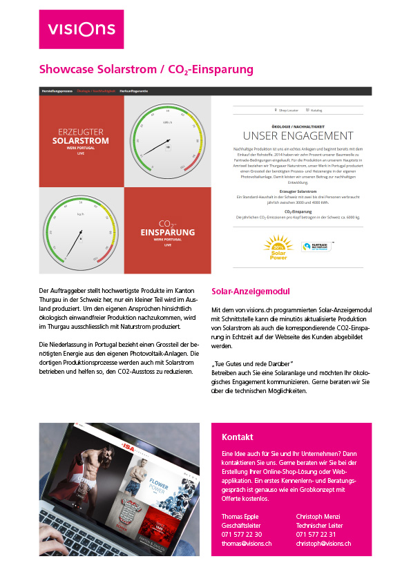 Die visions.ch Showcases beschreiben interessante Produkte und realisierte Lösungen, die sich individuell auf Kundenbedürfnisse anpassen lassen. Die von uns entwickelten Lösungen sind alle Webbasiert und nützen Open Source PHP & MySQL nach den aktuellen Webstandards.